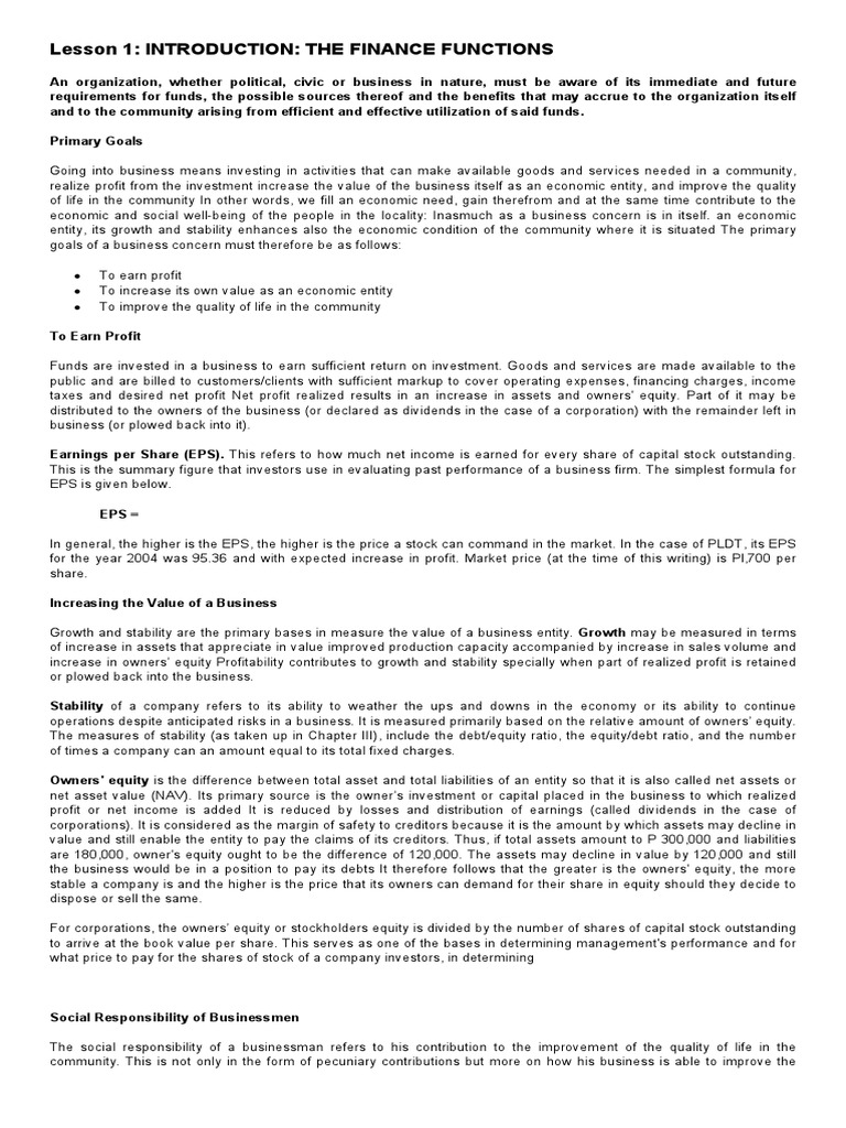 Lesson 1: INTRODUCTION: THE FINANCE FUNCTIONS