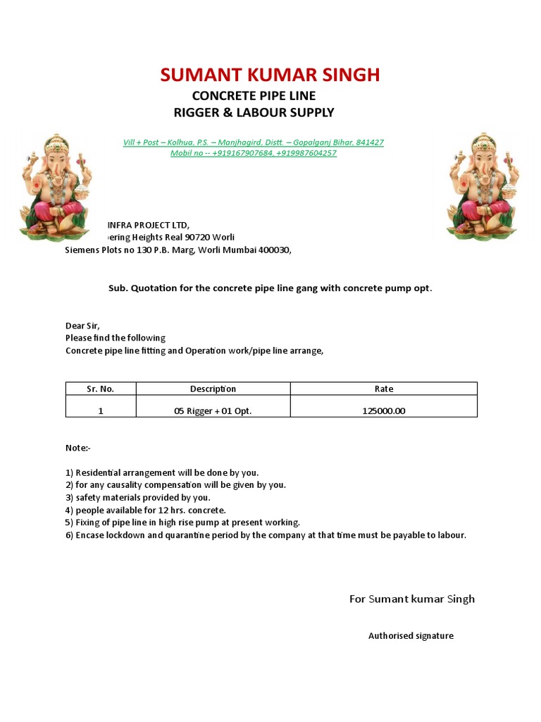 Sub. Quotation for the concrete pipe line gang with concrete pump opt .