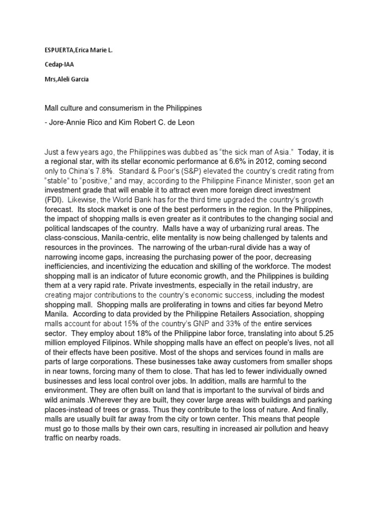 million employed Filipinos. While shopping malls have an effect on people's lives, not all