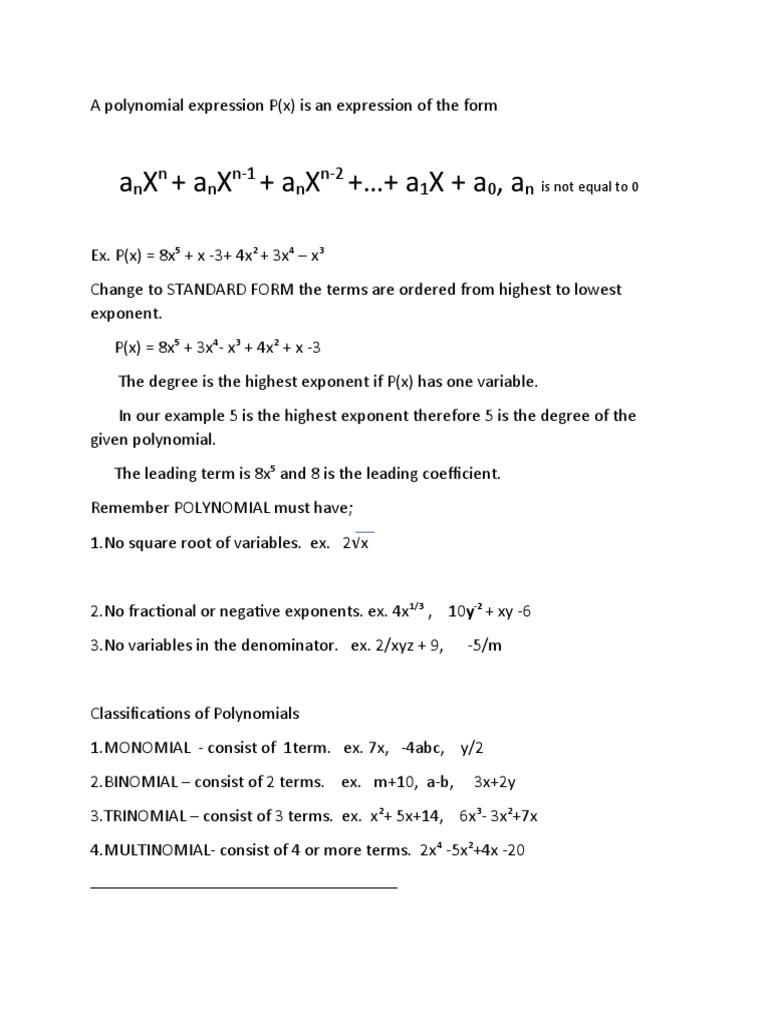 1.MONOMIAL - consist of 1term. ex. 7x, -4abc, y/2