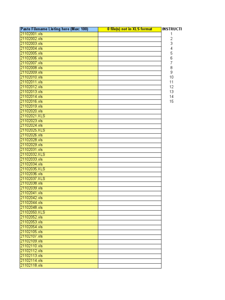 Paste Filename Listing here (Max: 100) 0 file(s) not in XLS format INSTRUCTIONS: