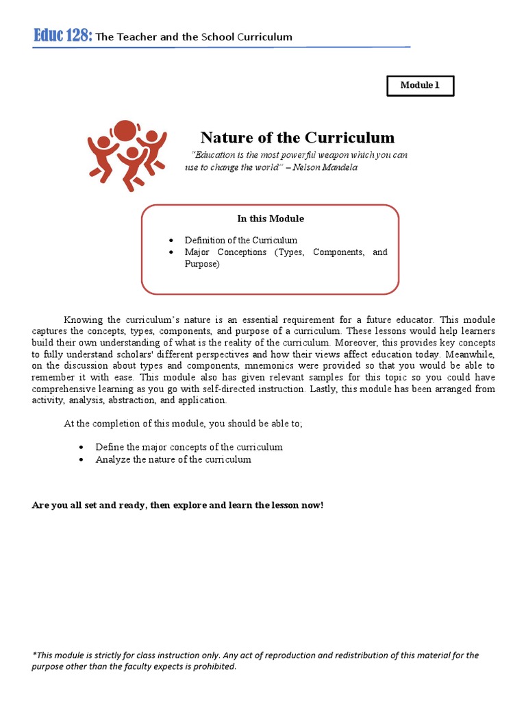 Knowing the curriculum’s nature is an essential requirement for a future educator. This module