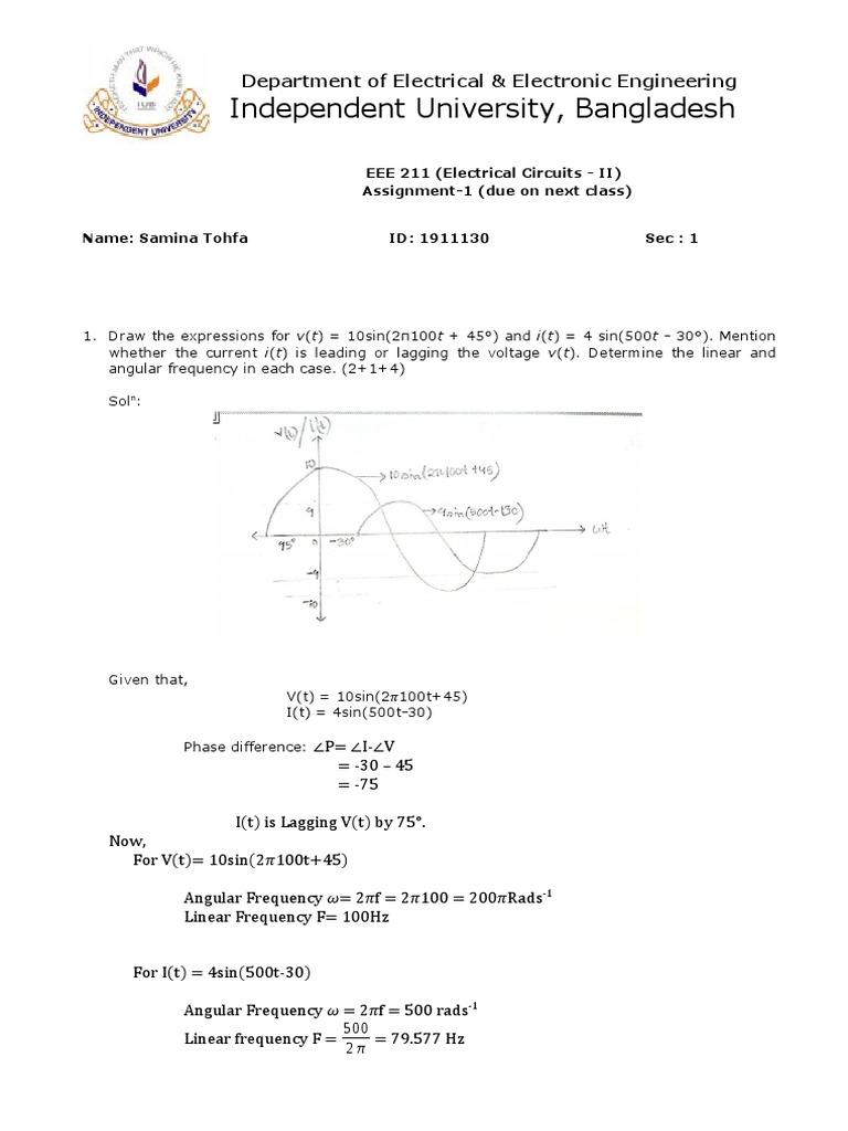 1. Draw the expressions for v(t) = 10sin(2π100t + 45°) and i(t) = 4 sin(500t - 30°). Mention