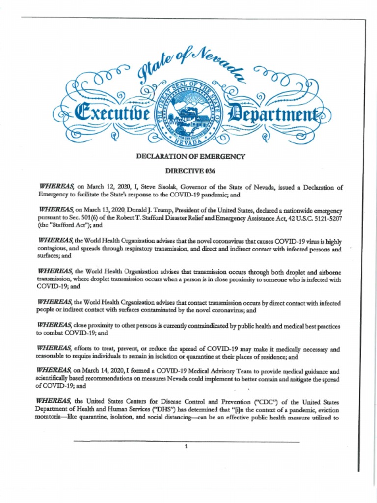 WHEREAS, oa Match 29, 2020, 1 sued Diseeive 008, to casure the safety of Nevadens and businesses by