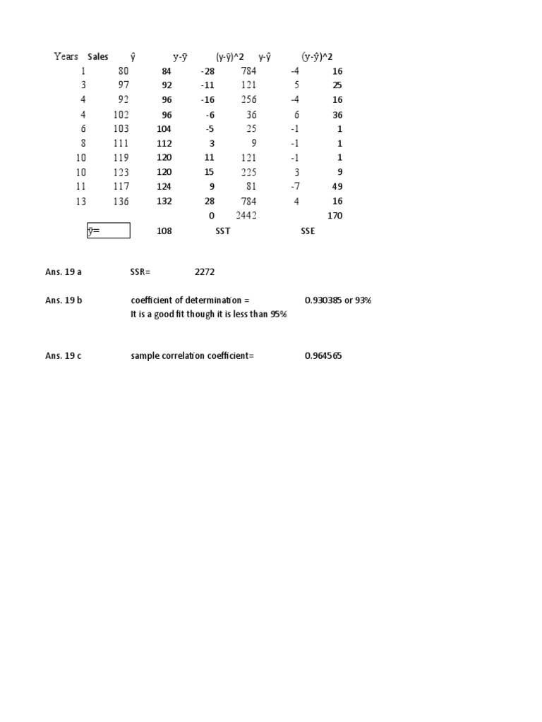 Years Sales ŷ y-ȳ (y-ȳ)^2 y-ŷ (y-ŷ)^2