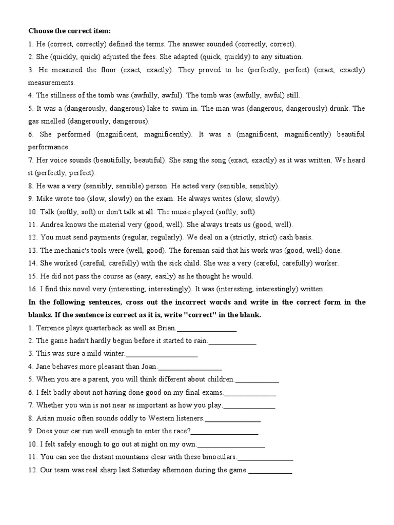 1. He (correct, correctly) defined the terms. The answer sounded (correctly, correct).