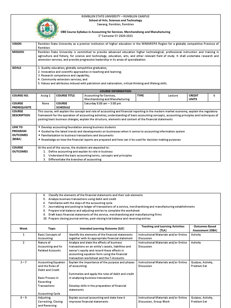 OBE Course Syllabus in Accounting for Services, Merchandising and Manufacturing