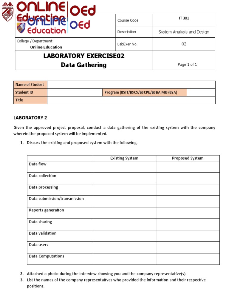 Given the approved project proposal, conduct a data gathering of the existing system with the company