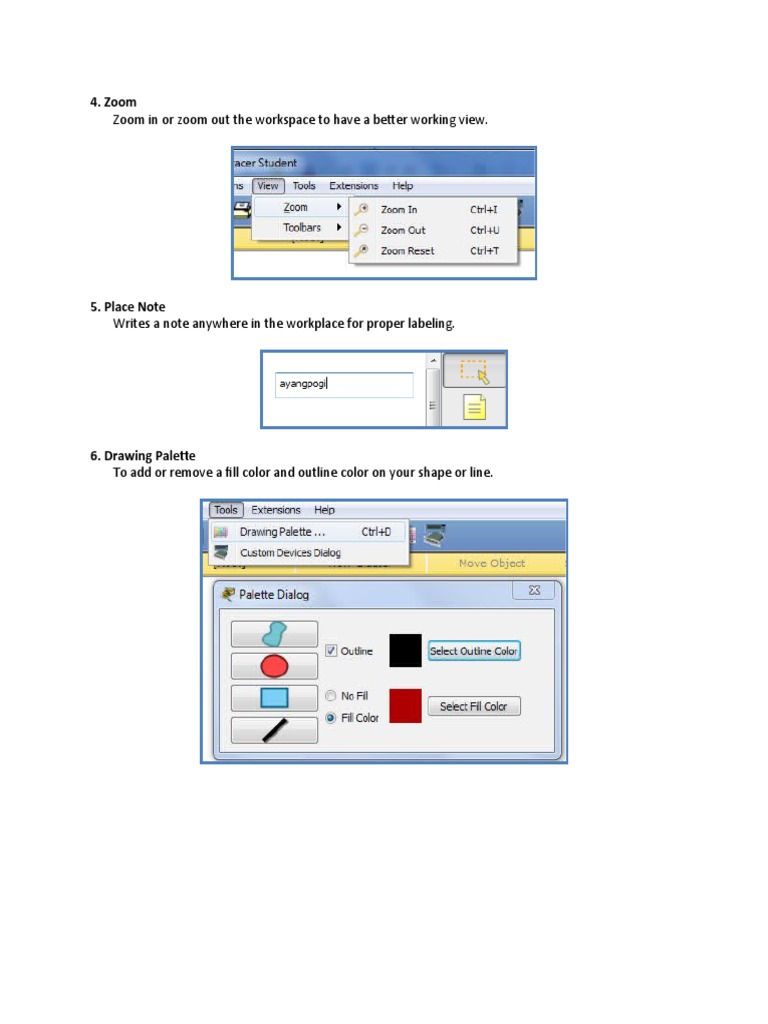 Zoom allows you to adjust the size of the workspace view for better visibility. Place Note lets you add labels anywhere for organization. Drawing Palette controls fill and outline colors for shapes and lines.