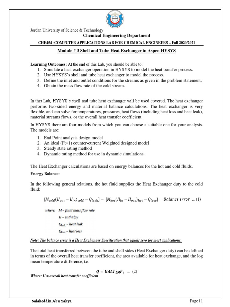 In this Lab, HYSYS’s shell and tube heat exchanger will be used covered. The heat exchanger