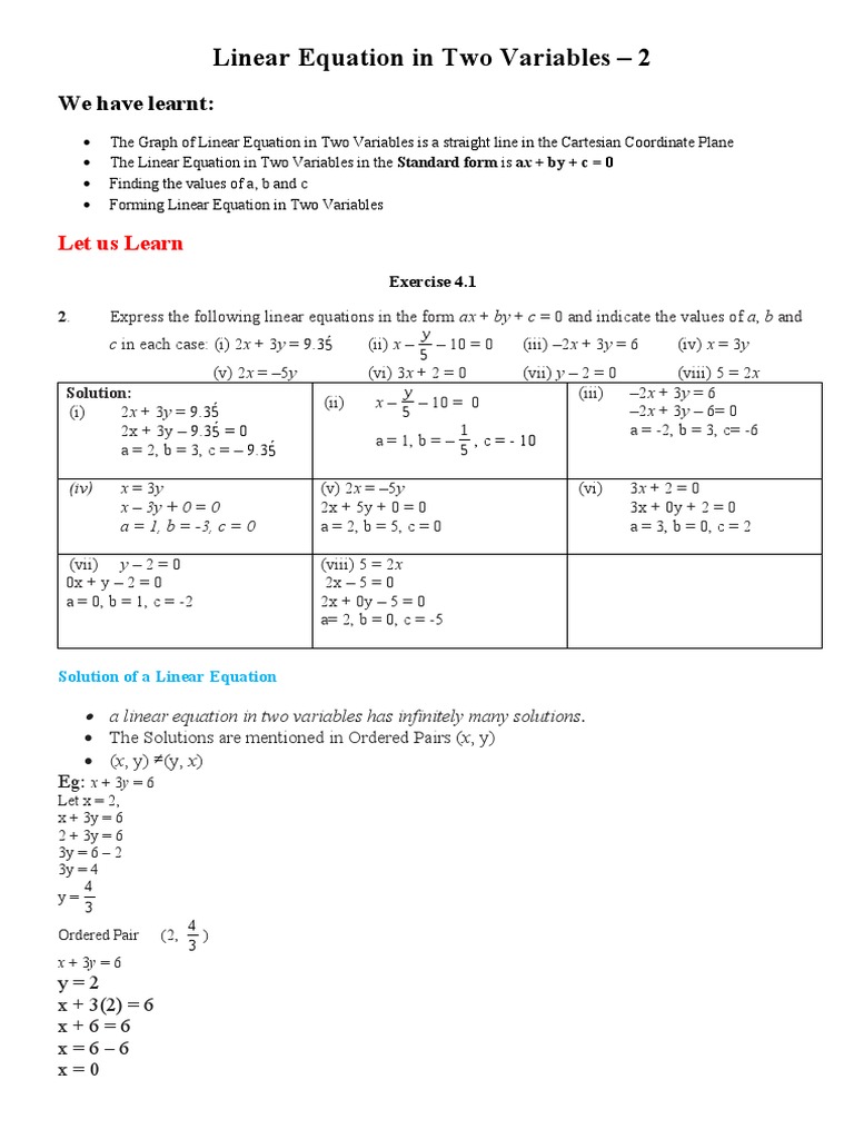 The Linear Equation in Two Variables in the Standard form is ax + by + c = 0