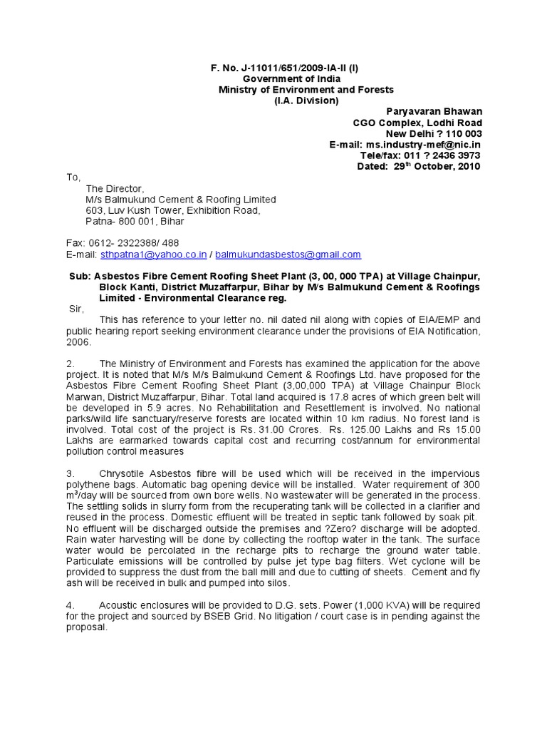 Sub: Asbestos Fibre Cement Roofing Sheet Plant (3, 00, 000 TPA) at Village Chainpur,