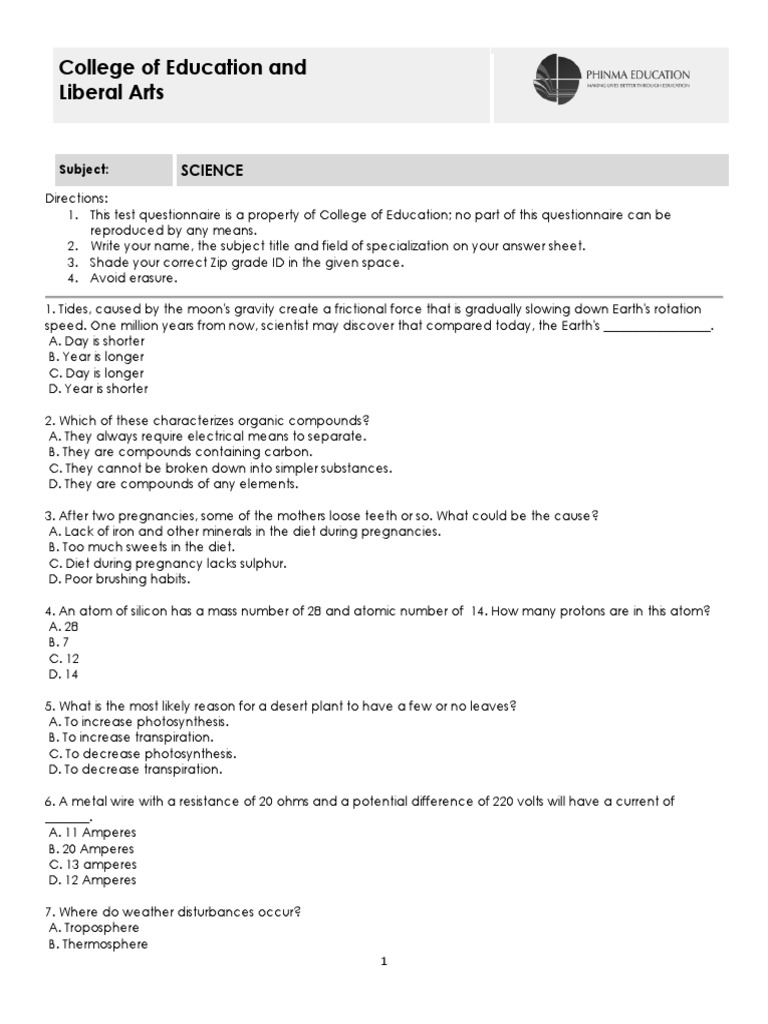 1. This test questionnaire is a property of College of Education; no part of this questionnaire can be