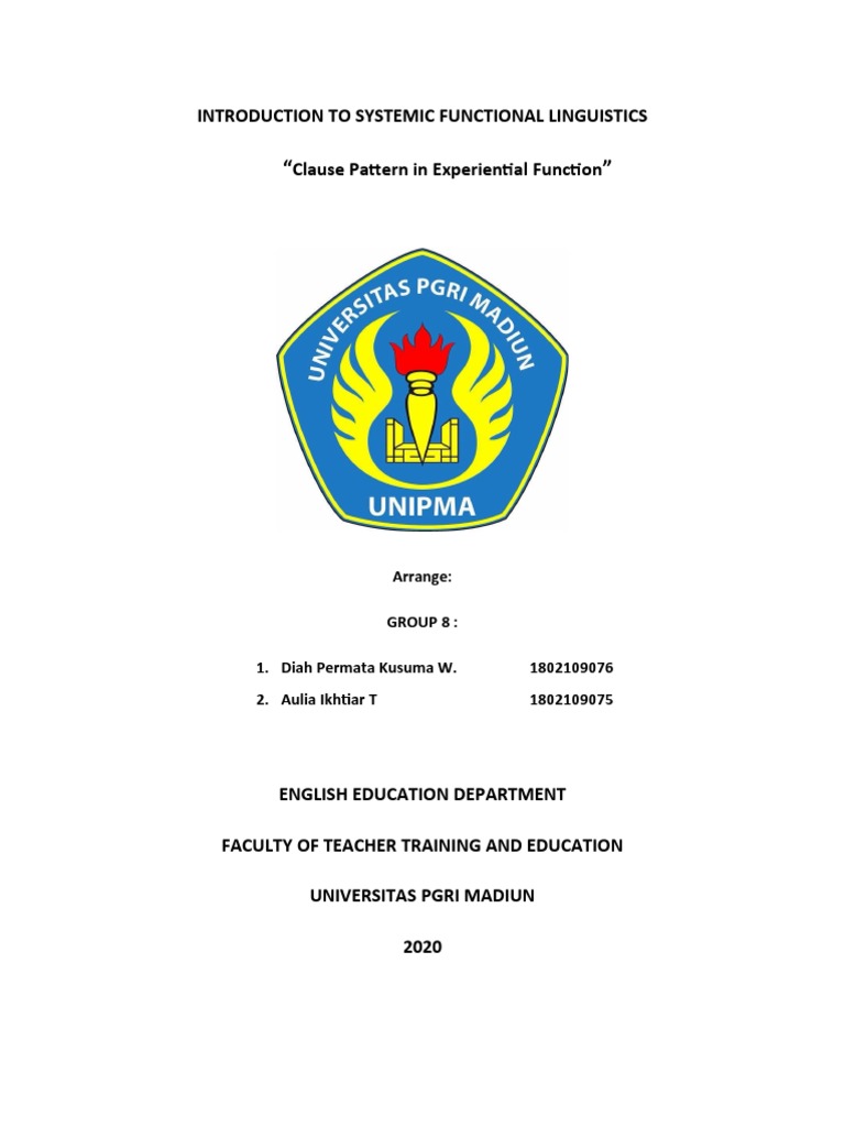 paper assignment entitled “Clause pattern in experiential function”. The writer also wish to