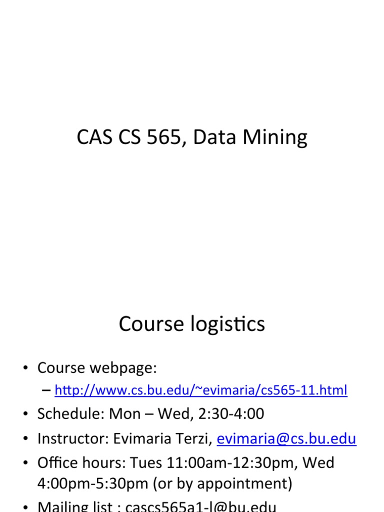 • Instructor: Evimaria Terzi, evimaria@cs.bu.edu