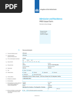 This document appears to be an application form for a visa or residence permit in the Netherlands. It requests personal details such as name, date of birth, passport information, contact details, and purpose of stay. Applicants must provide details about employment, family, study, or other reasons for visiting and sign declaring the information is truthful.