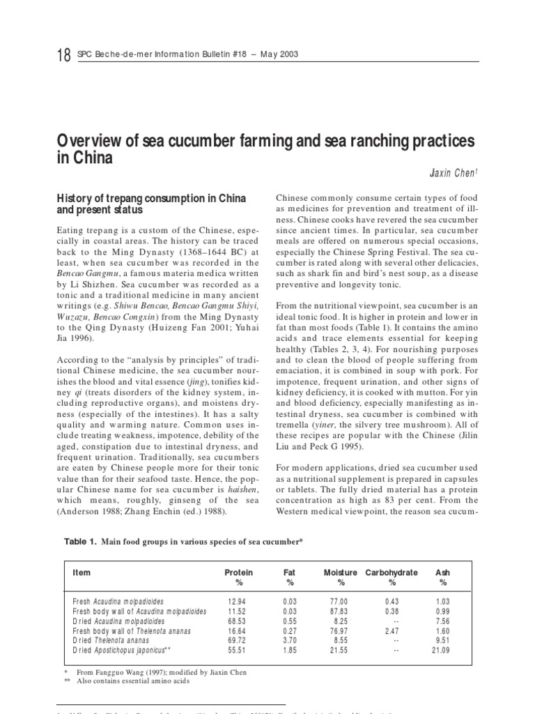 Eating trepang is a custom of the Chinese, espe- since ancient times. In particular, sea cucumber