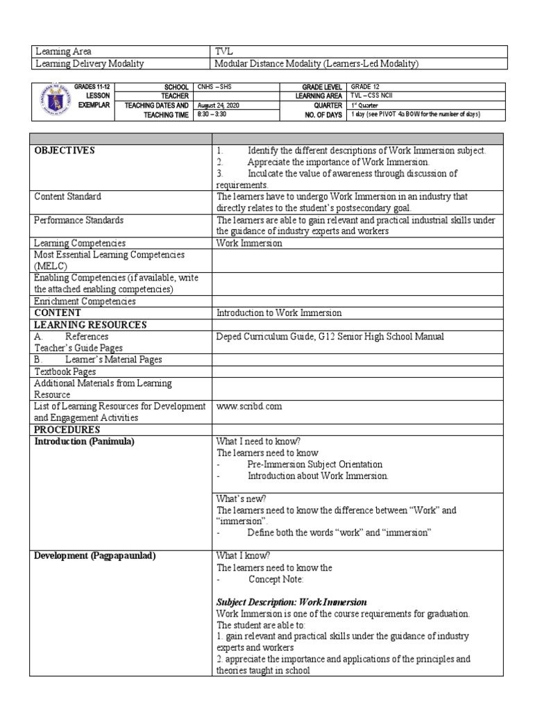 LESSON TEACHER LEARNING AREA TVL – CSS NCII