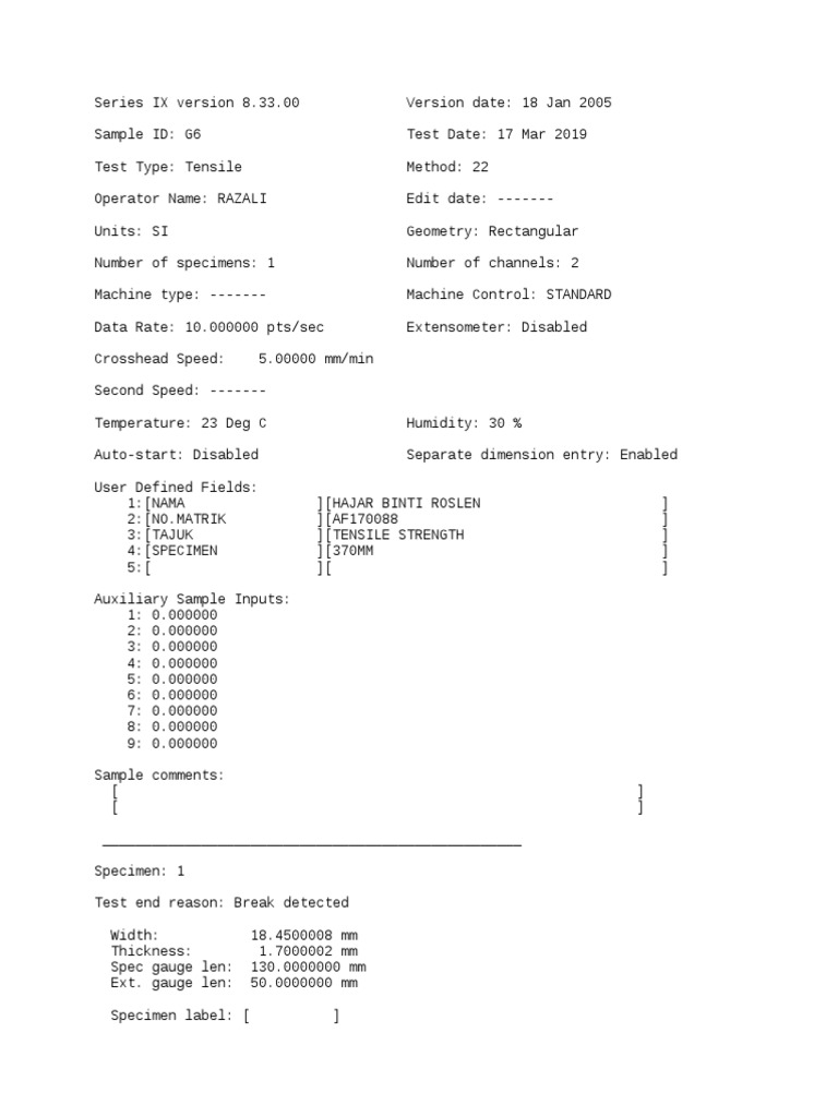 Data Rate: 10.000000 pts/sec Extensometer: Disabled