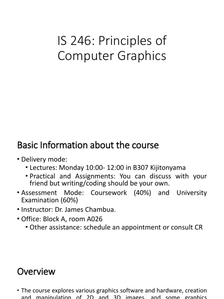 • Lectures: Monday 10:00- 12:00 in B307 Kijitonyama