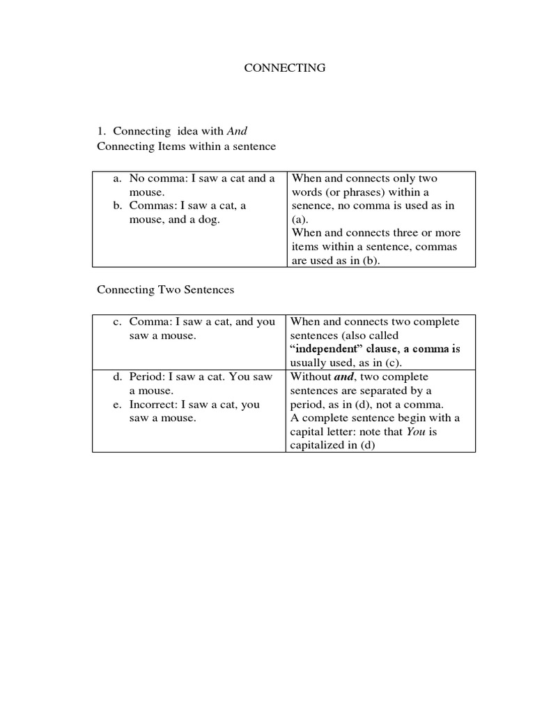 b. Commas: I saw a cat, a senence, no comma is used as in