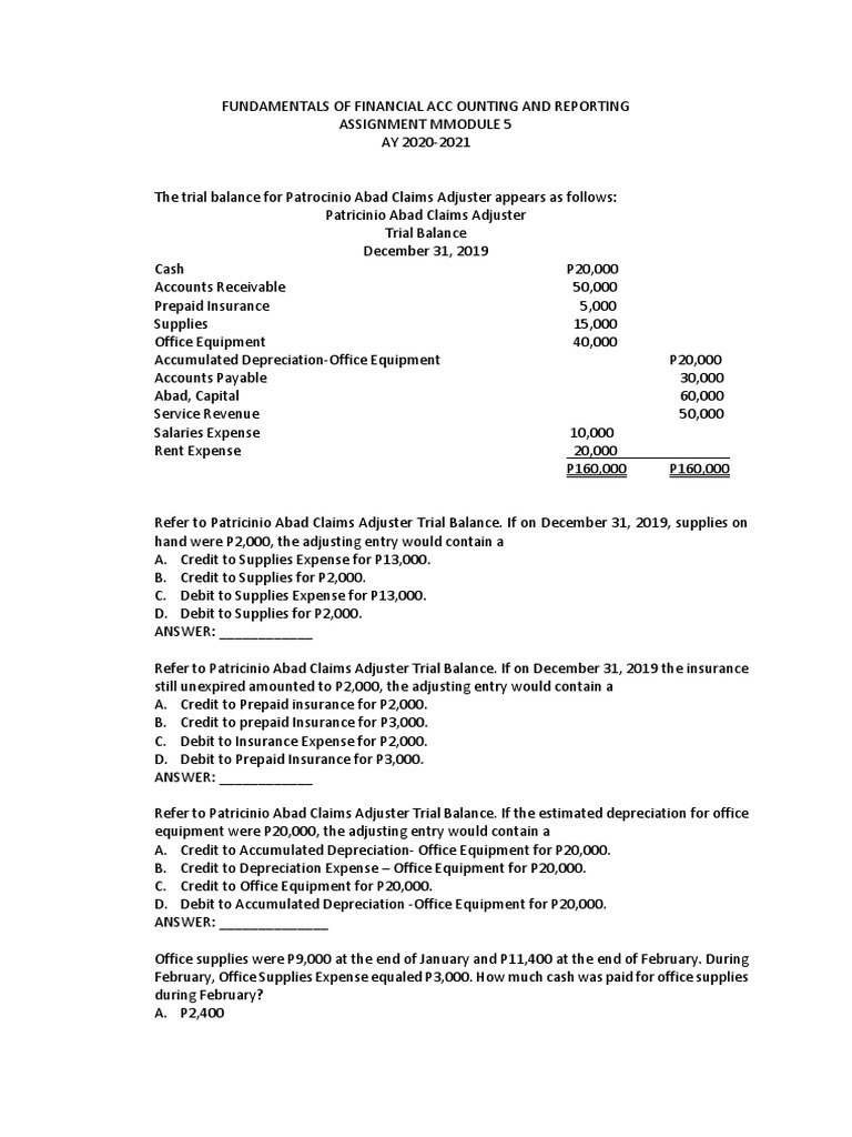 Refer to Patricinio Abad Claims Adjuster Trial Balance. If the estimated depreciation for office