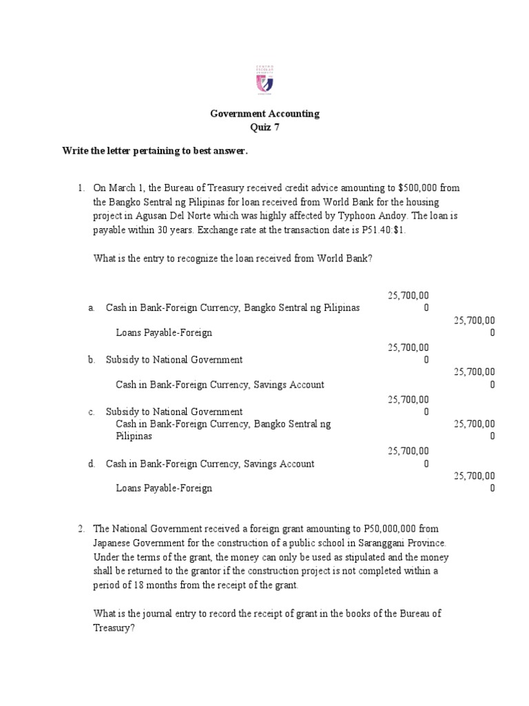 1. On March 1, the Bureau of Treasury received credit advice amounting to $500,000 from