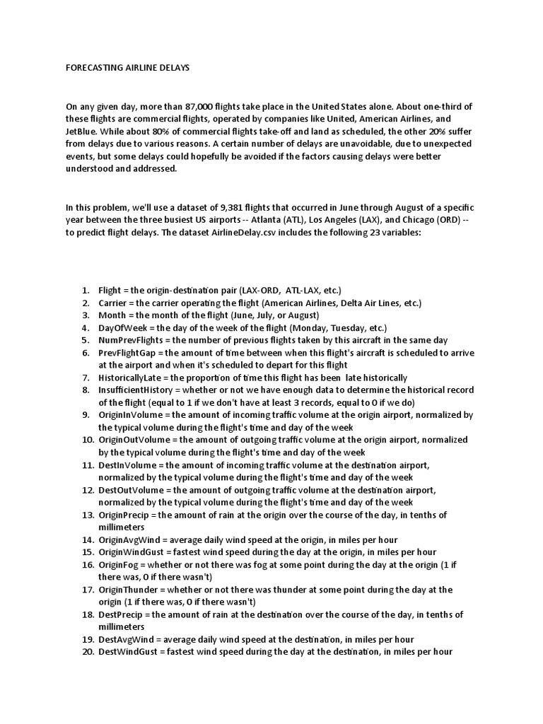 to predict flight delays. The dataset AirlineDelay.csv includes the following 23 variables: