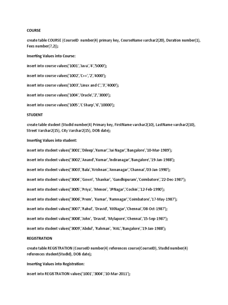 6. select r.studid,add_months(r.doj,c.duration) as DOC from registration r, course c;