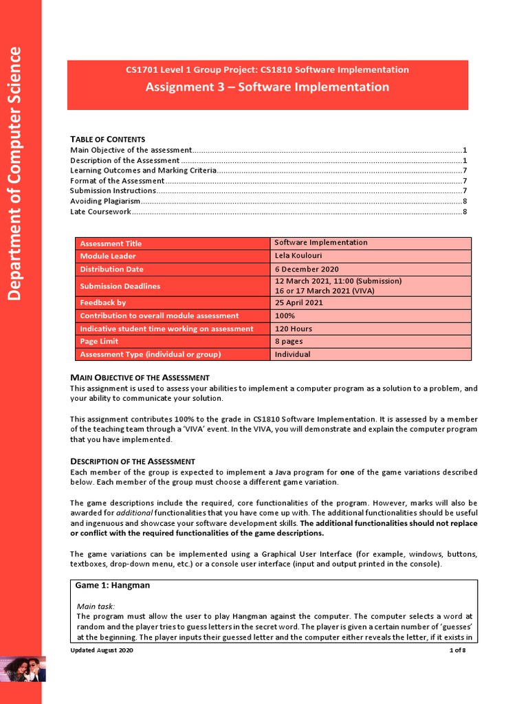 explanations at the VIVA, you will fail the VIVA and your grade in this assignment (CS1810 – Software