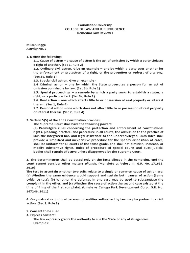 1.1. Cause of action – a cause of action is the act of omission by which a party violates
