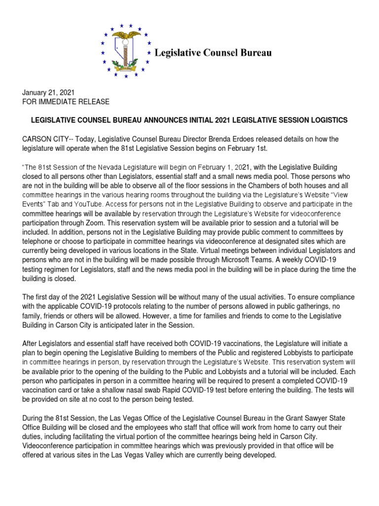 LEGISLATIVE COUNSEL BUREAU ANNOUNCES INITIAL 2021 LEGISLATIVE SESSION LOGISTICS