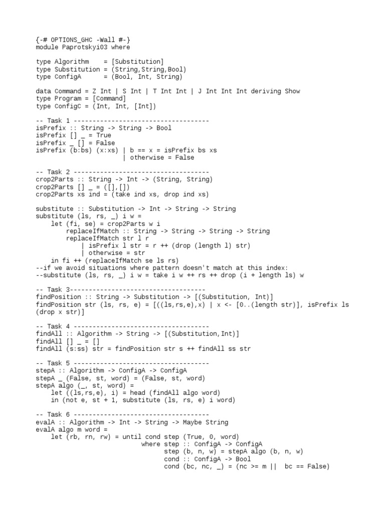 -- Task 5 ------------------------------------ stepA :: Algorithm -> ConfigA -> ConfigA stepA _ (False, st, word) = (False, st, word) stepA algo (_, st, word) = let ((ls,rs,e), i) = head (findAll algo word) in (not e, st + 1, substitute (ls, rs, e) i word)