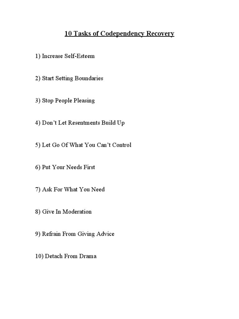 This document outlines 10 tasks for recovering from codependency, including increasing self-esteem, setting boundaries, putting one's own needs first, asking for what you need, giving in moderation, refraining from giving advice, and detaching from drama. The tasks also involve stopping people pleasing, not letting resentments build up, letting go of what you can't control, and giving in moderation.