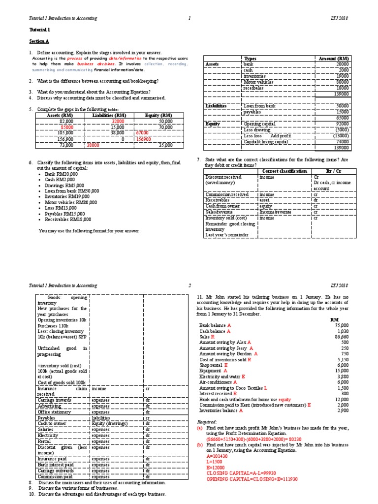 Tutorial 1 Introduction to Accounting 1 LTJ 2018
