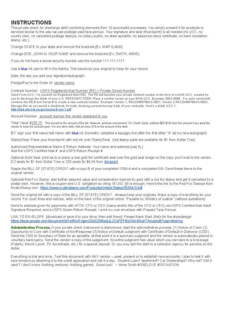 you to discharge the debts of your U.S. PERSON/CITIZEN. Place a number series on your NON-UCC. Example: 0001-9999. For each vendor/bill,