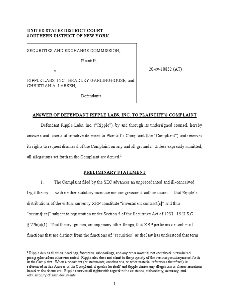 ANSWER OF DEFENDANT RIPPLE LABS, INC. TO PLAINTIFF’S COMPLAINT