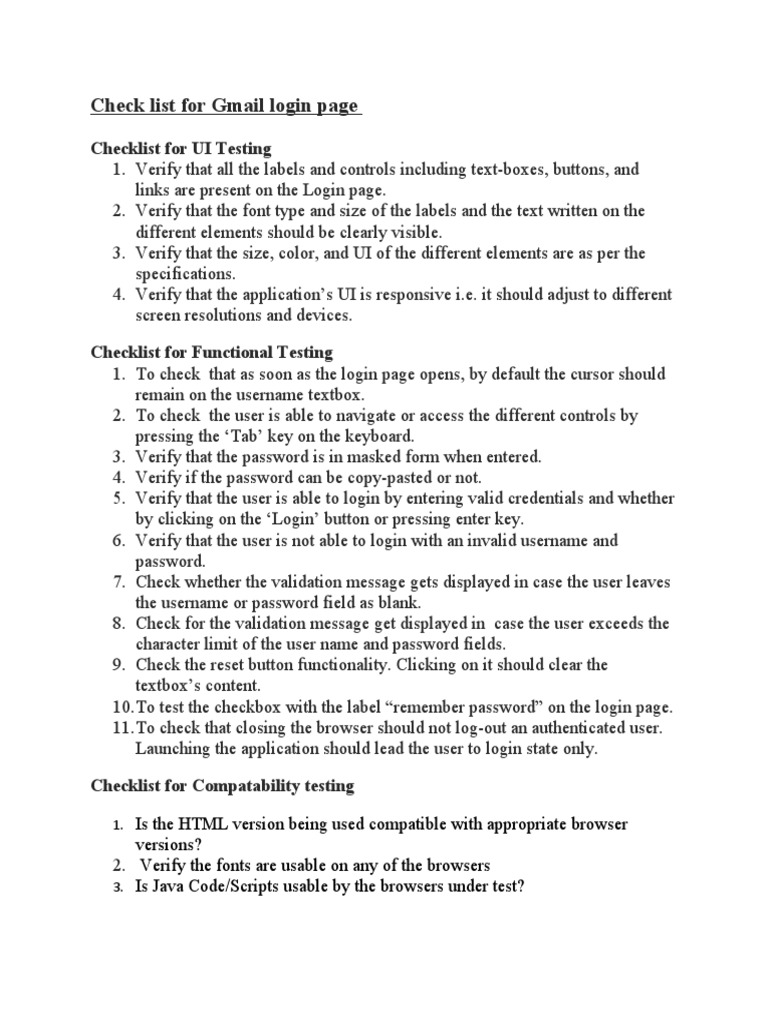 Check list for Gmail login page