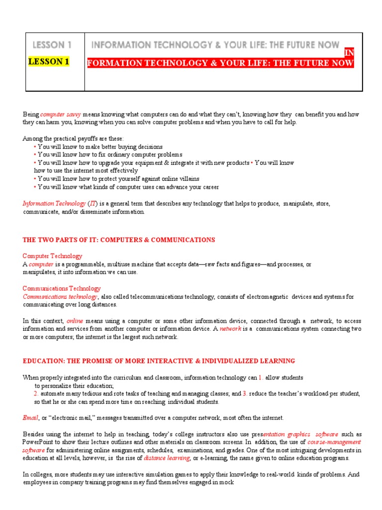 LESSON 1 FORMATION TECHNOLOGY & YOUR LIFE: THE FUTURE NOW