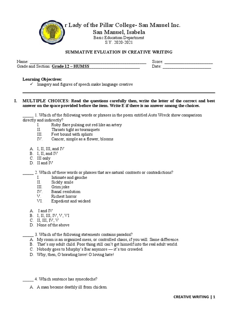 SUMMATIVE EVLUATION IN CREATIVE WRITING