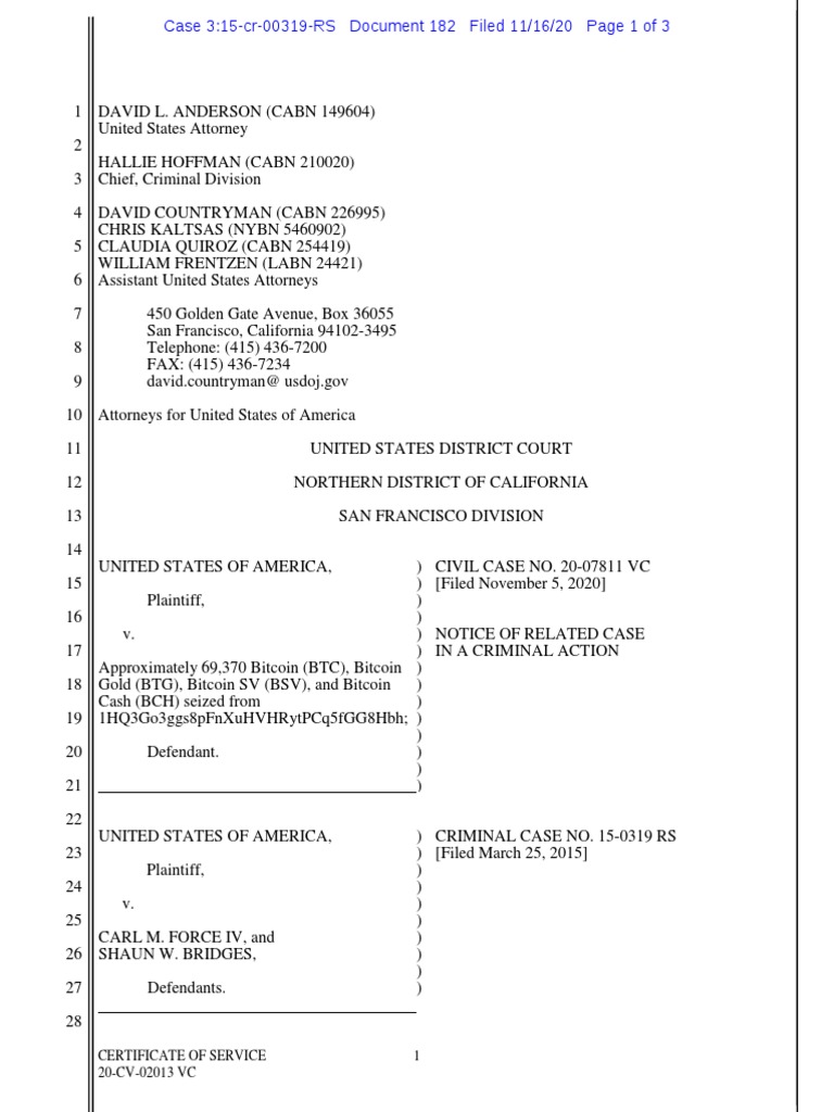 12 A criminal complaint, United States v. Carl M. Force IV and Shaun W. Bridges, Case No. 20-