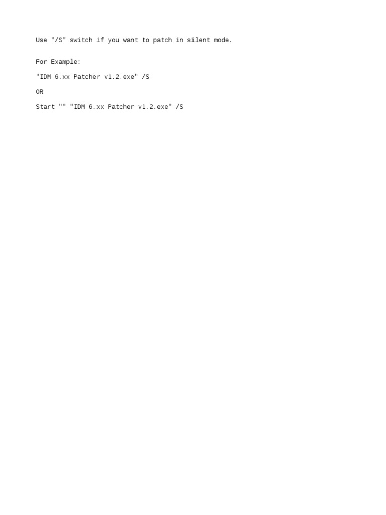 This document provides instructions for silently patching software using the "/S" switch, which allows patching to occur without any user interface or prompts. It gives the example of using "IDM 6.xx Patcher v1.2.exe /S" or "Start "" "IDM 6.xx Patcher v1.2.exe" /S" to silently patch the IDM 6.xx software without any dialog boxes or confirmation prompts.
