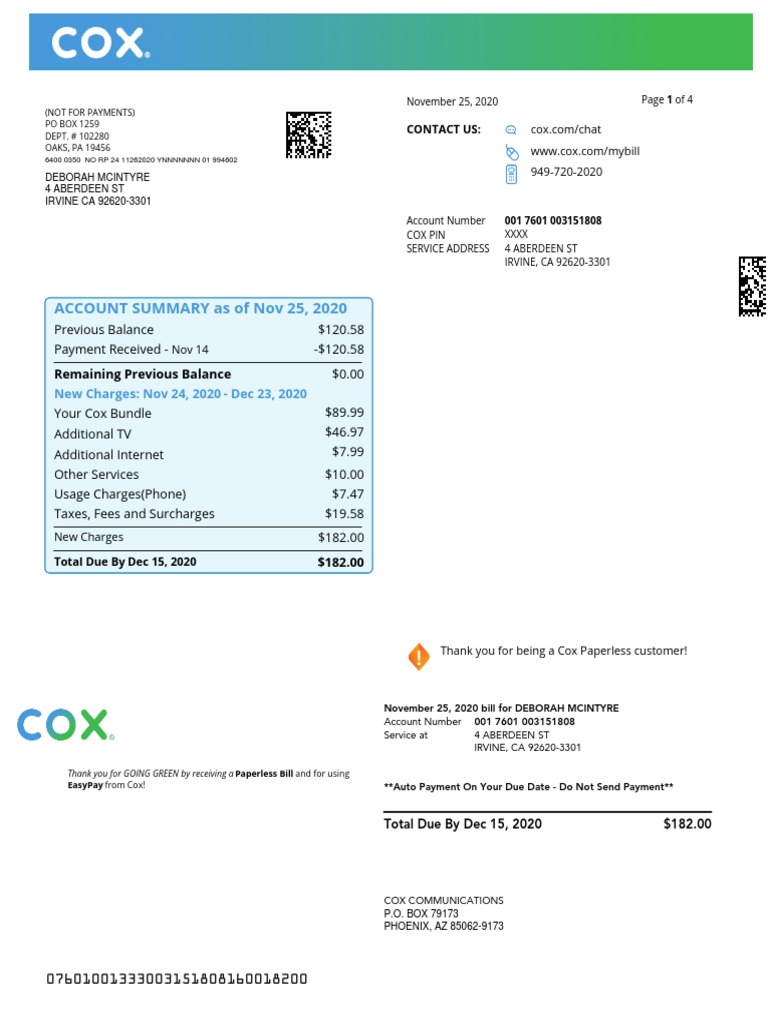 TOTAL NEW CHARGES $182.00 Phone Customers: If after contacting Cox we are unable to resolve your