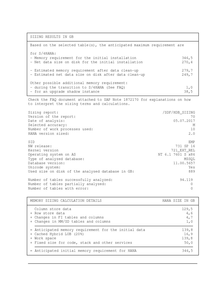 MEMORY SIZING CALCULATION DETAILS HANA SIZE IN GB