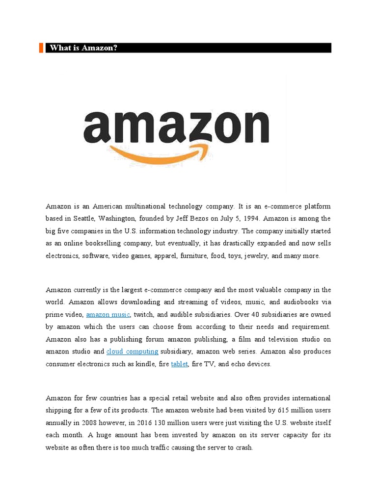 Amazon is an American multinational technology company. It is an e-commerce platform
