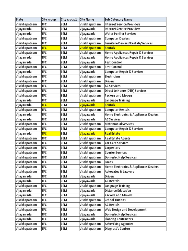 Andhra Pradesh Other cities SEM Other cities AC Services