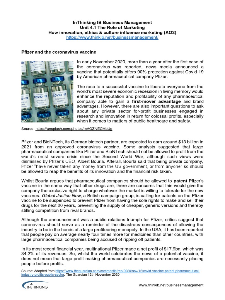 (d) Discuss whether it is ethical for a business such as Pfizer to gain financially from a