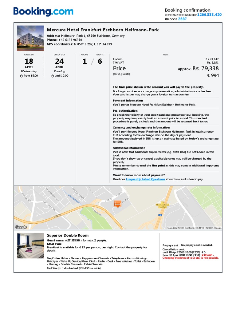 This print version of your confirmation contains the most important information about your booking. It can be used to check in when you arrive at Mercure Hotel Frankfurt