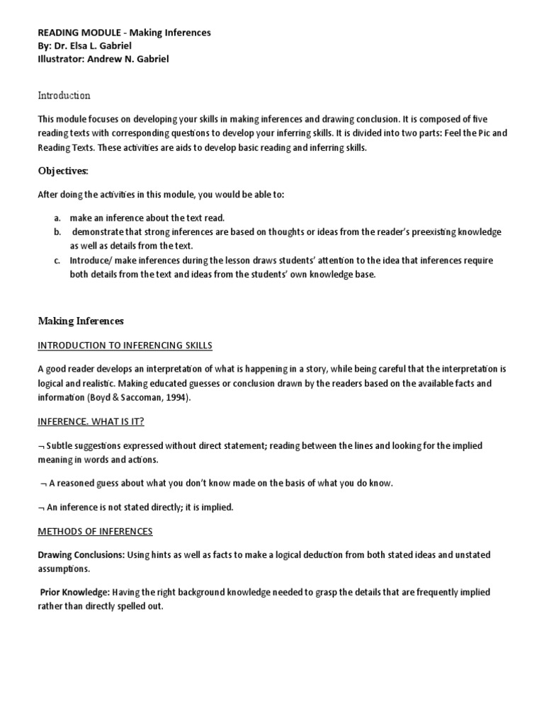 This module focuses on developing your skills in making inferences and drawing conclusion. It is composed of five