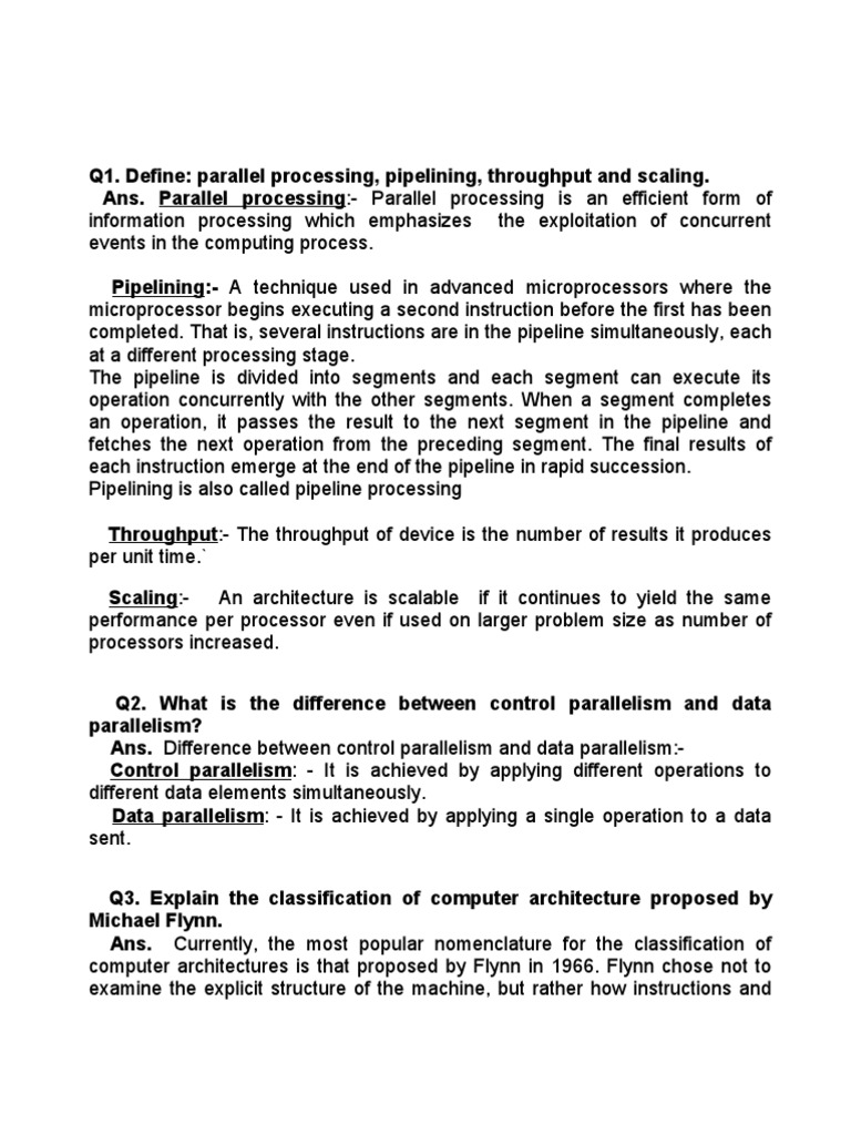 Q1. Define: parallel processing, pipelining, throughput and scaling.